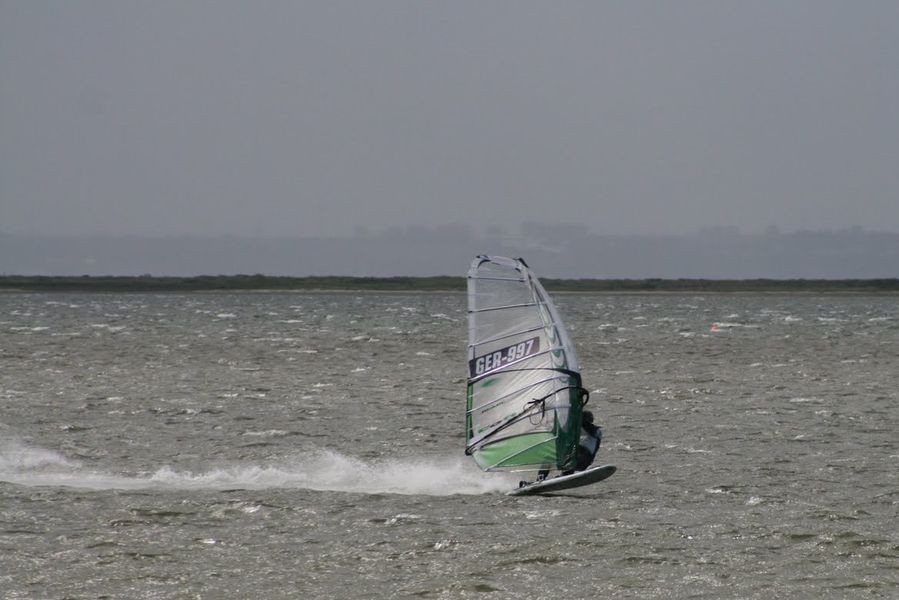 immer beliebteren und verbreiteten GPS-Geräten. Was kann ich nun tun um meine Geschwindigkeit, meinen Speed zu verbessern? Genau genommen sind es mehrere, voneinander abhängige Faktoren, die schnell machen: Die Wasseroberfläche bzw. das Gewässer auf dem gefahren wird. An einem Spot mit ablandigem Wind und spiegelglattem Wasser sind hohe Geschwindigkeiten wesentlich einfacher zu erreichen, als etwa an einem kabbeligen Binnensee. Leider haben nur die wenigsten von uns die Möglichkeit, in einem optimalen Speedrevier surfen zu können. Wichtig ist es deshalb, die Wasseroberfläche genau zu beobachten, zu „lesen“. Beim schnell surfen, sollte man versuchen, das Board so flach wie möglich durch die Wellenlandschaft zu fahren. Versuche so zu fahren, dass – auch kleine – Kabbelwellen nicht auf die Luvkante Deines Boards kommen, das bremst. Fahre möglichst durch die Wellentäler, falle dabei aber nicht zu stark ab. Größere Windwellen fährst Du leeseitig (Richtung Wellental) herunter. Umso schneller Du fährst umso wichtiger ist es, die Wasseroberfläche vor Dir konzentriert zu beobachten und den idealen Weg durch die Wasserlandschaft zu finden. Ein Fehler kann zu heftigen Stürzen führen. Der schnellste Kurs den Windsurfer fahren, ein leichter Raumwindkurs, ist nur auf spiegelglattem Wasser permanent gut zu halten und auch nur da wirklich schnell. Im Kabbelwasser sind demnach immer wieder kleinere Kurskorrekturen notwendig, um bremsenden Kabbelwellen auszuweichen und den optimalen, schnellen „Pfad“ zwischen den Wellen zu fahren. |